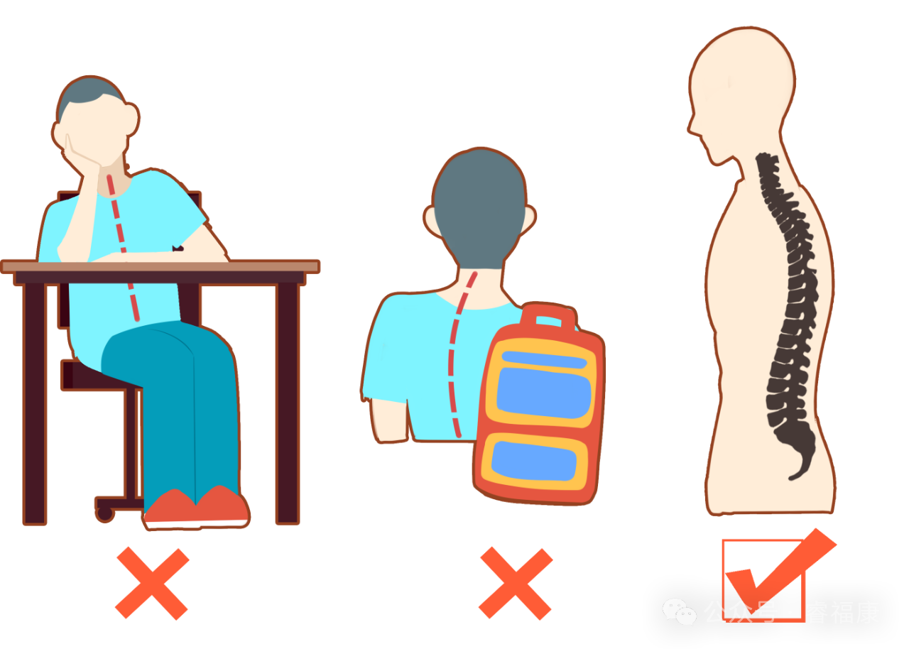 1、督促孩子养成正确坐姿和站姿,保持健康用脊习惯和意识。